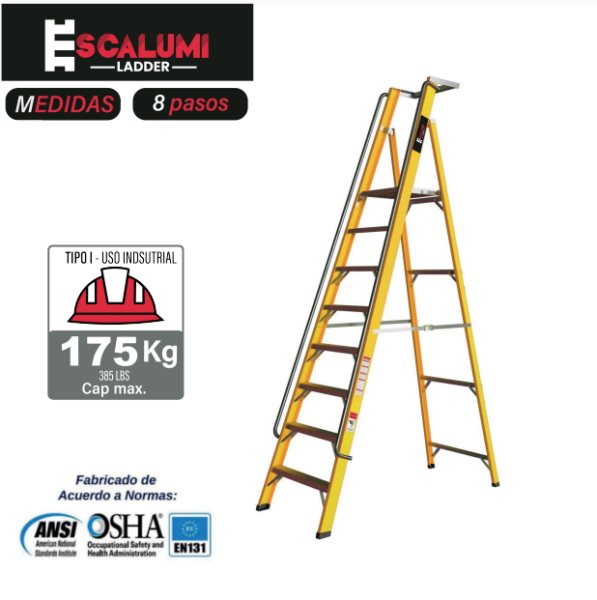 Las escaleras Plataforma Escalumi Ladder tiene sus rieles fabricados en PRFV/FRP (Plástico Reforzado en Fibra de Vidrio), un material no conductor de electricidad, lo que hacen que esta escalera sea ideal para trabajar en ambientes muy exigentes con riesgo eléctrico, corrosión y exposición a la intemperie. Con una capacidad de carga de más de 175kg, nuestras escaleras son de uso pesado y duraderas. Uso de almacenes, interiores y exteriores, para trabajos prolongados, dando mayor comodidad y seguridad al usuario. Las zapatas antideslizantes se adaptan al lugar donde se utilice la escalera brindando excelente estabilidad en terreno plano. Diseñadas con estructura de fibra de vidrio de alta resistencia, zapatas antideslizantes, uso pesado para toda aplicación industrial.
