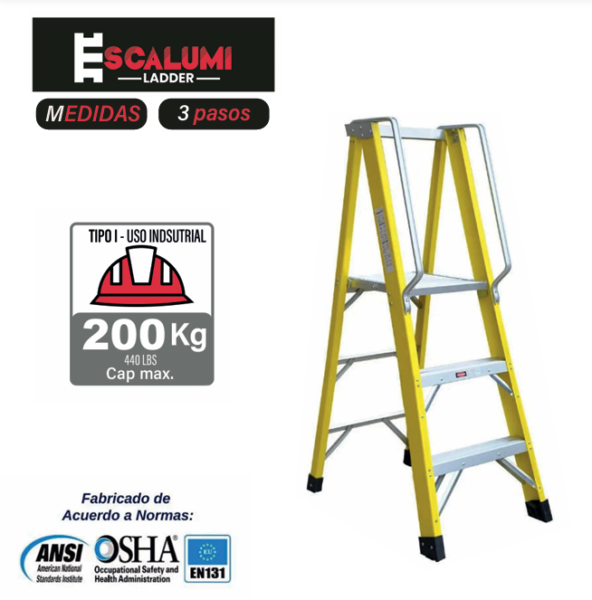 Escalera de Fibra de Vidrio Tijera Plataforma, Tipo I (Industrial), Dieléctrica (No Conduce Electricidad), marca Escalumi Ladder, de uso profesional o industrial que requieren ayuda en sus trabajos de construcción, uso cotidiano y trabajos prolongados, ideal para trabajar en ambientes muy exigentes con riesgo eléctrico, corrosión y exposición a la intemperie, para alcanzar esos lugares de alturas media – alta. El Cuerpo de la Escalera es elaborada de Plástico reforzado con Fibra de Vidrio (PRFV) y peldaños de Aluminio con superficie antideslizante, con capacidad de carga máxima en los peldaños de 200 kg de tolerancia confirmada, capacidad dieléctrica de C.A: 90 Kv y C.D: 25 Kv, patas con antideslizantes que genera mayor firmeza durante su uso. Puede ascender por ambos lados simultáneamente dos personas y alcanzar una altura máxima de 2.90 mts.
